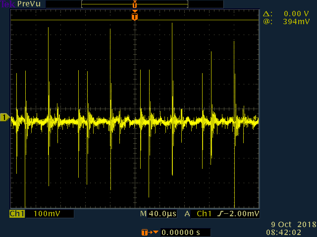 Measurement of an Ethernet port with the VFD powered on; without using an EMI filter. The switching frequency of the VFD negatively affects the quality of the Ethernet port, increasing the risk of communication system failures, which defeats the purpose of the Ethernet port.